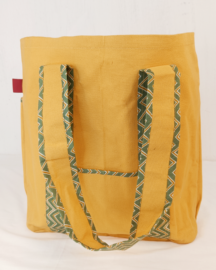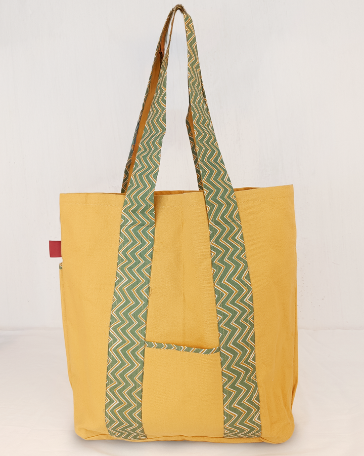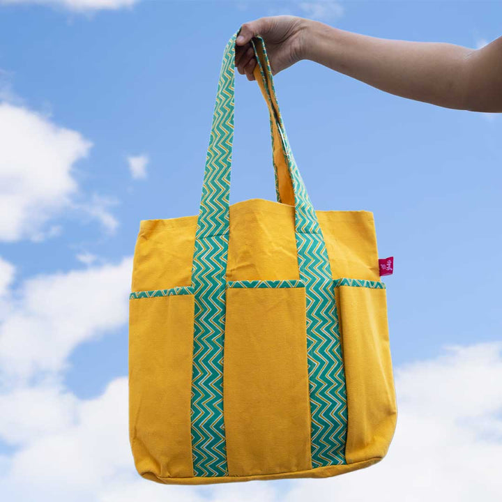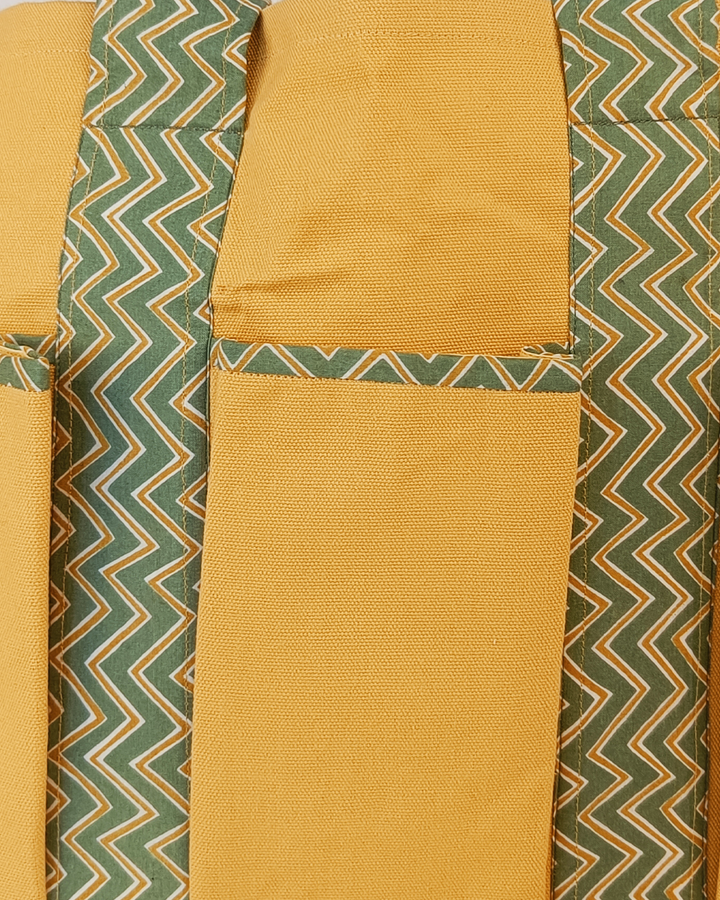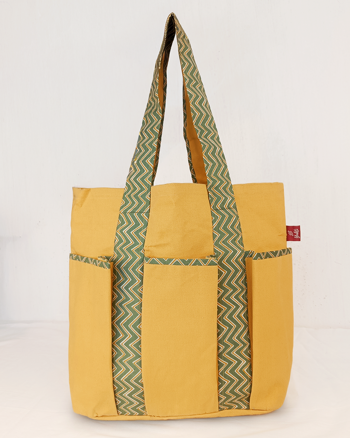 Sunshine Chevron Tote Bag – Yellow & Green Cotton Canvas Tote with Multiple Pockets | Yukti