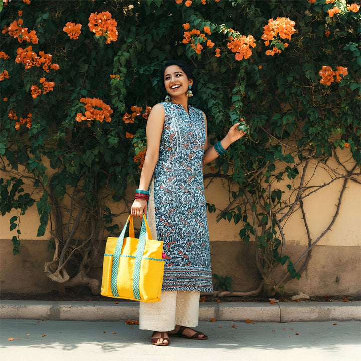 Yukti Sunshine Chevron Tote – Bold Yellow Canvas with Green Zig-Zag Design & Smart Pockets