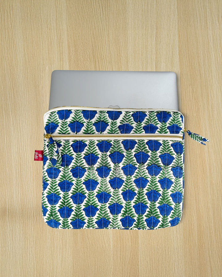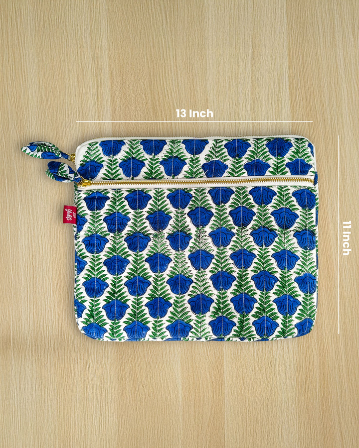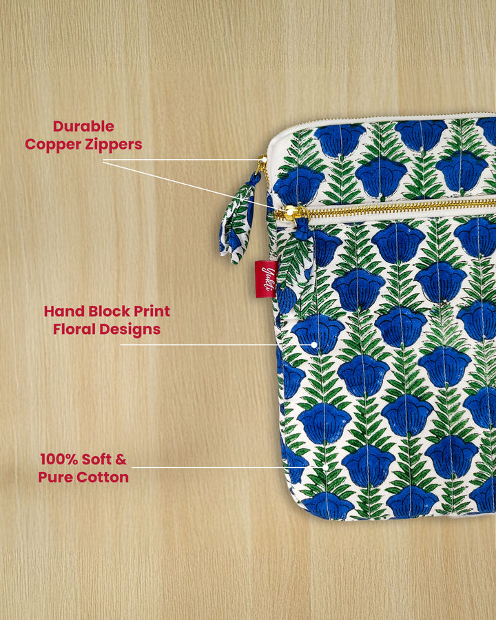 Premium Blue Floral Handblock Printed Laptop Sleeve: Handcrafted with a stunning floral print that combines traditional block printing with modern utility.