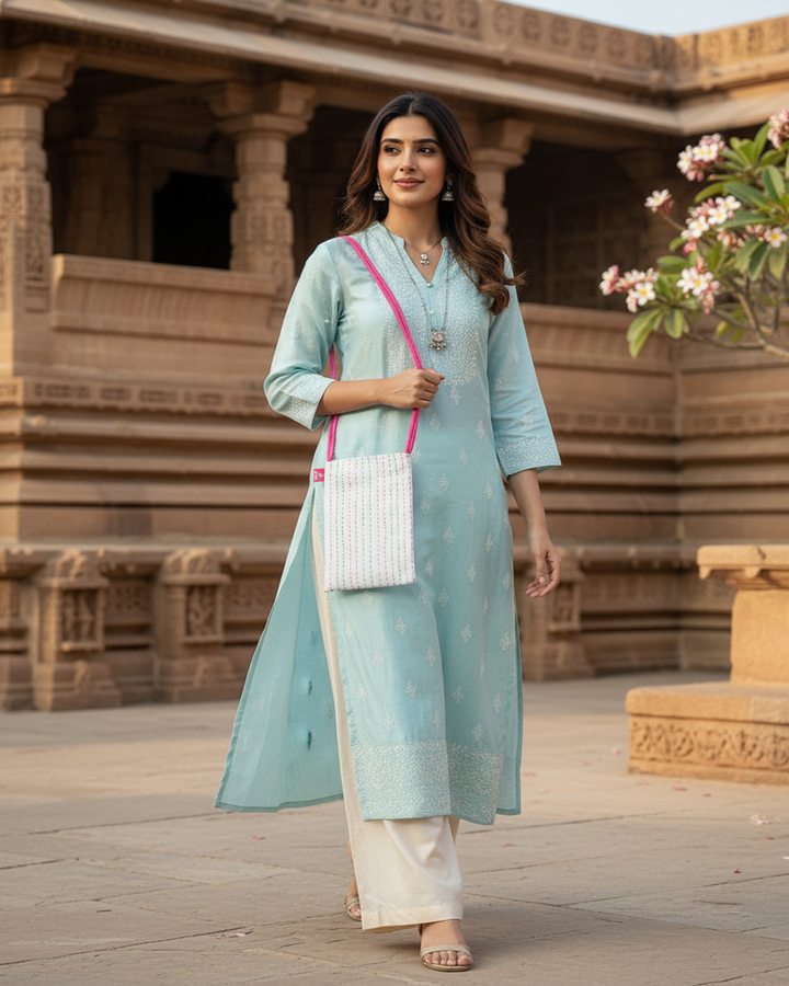 Embrace simple elegance with the Yukti Kantha Stitch Cotton Sling Bag, inspired by traditional hand-stitched artistry and clean, minimalist design. Handcrafted from soft, breathable cotton, this subtly textured sling combines comfort, strength, and understated charm. Measuring 13x11 inches, it offers ample space for your daily essentials, while the magnetic closure keeps everything secure. The small inner pocket adds practicality, and the long, strong strap ensures comfort wherever you go. Rooted in Yukti’s philosophy of balance, nature, and mindfulness, the Kantha Stitch Sling Bag carries a touch of artisanal heritage in every thread — your ideal companion for everyday journeys.