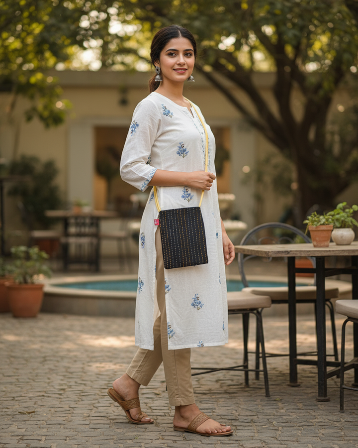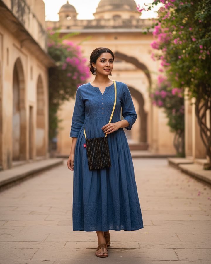 Embrace sophisticated simplicity with the Yukti Midnight Ember Cotton Sling Bag, inspired by the subtle glow of embers against a dark sky and traditional hand-stitched details. Handcrafted from soft, breathable cotton, this subtly textured sling combines comfort, strength, and modern charm. Measuring 13x11 inches, it offers ample space for your daily essentials, while the magnetic closure keeps everything secure. The small inner pocket adds practicality, and the long, strong strap ensures comfort wherever you go. Rooted in Yukti’s philosophy of balance, nature, and mindfulness, the Midnight Ember Sling Bag carries a touch of artisanal elegance in every thread — your ideal companion for everyday journeys.