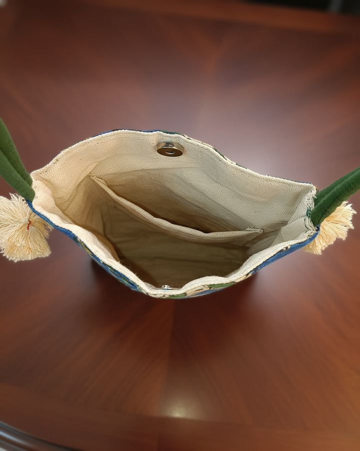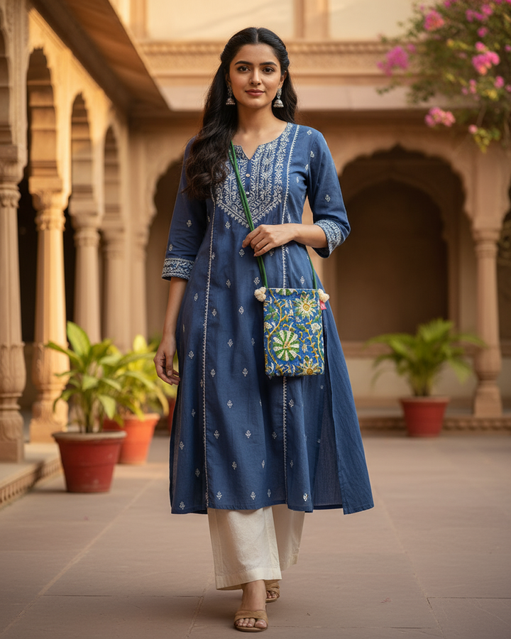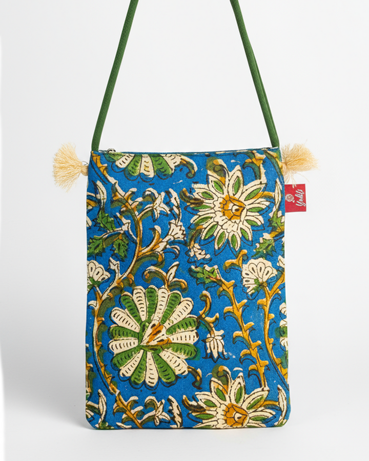 Celebrate the art of natural beauty with the Yukti Teal Bloom Cotton Sling Bag, inspired by the serene depth of blooming flowers against a cool teal sky. Handcrafted from soft, breathable cotton, this floral-patterned sling combines comfort, strength, and subtle elegance. Measuring 13x11 inches, it offers ample space for your daily essentials, while the magnetic closure keeps everything secure. The small inner pocket adds practicality, and the long, strong strap ensures comfort wherever you go. Rooted in Yukti’s philosophy of balance, nature, and mindfulness, the Teal Bloom Sling Bag carries a touch of the earth’s calm in every thread — your ideal companion for everyday journeys.