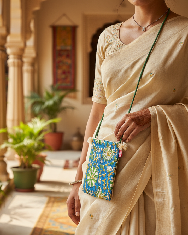 Yukti Teal Bloom Cotton Sling Bag – 13x11 in | Handcrafted Floral Sling with Magnetic Closure, Inner Pocket & Long Strap